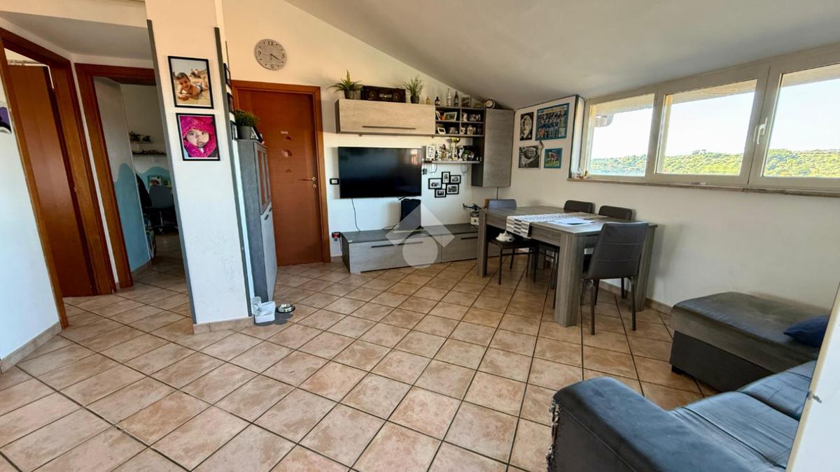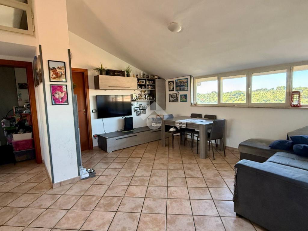 Il soggiorno, con l’uscita sul terrazzo, è il luogo ideale per rilassarsi o condividere momenti in compagnia, mentre la cucina a vista, semi abitabile, rende lo spazio pratico senza rinunciare al calore della convivialità.